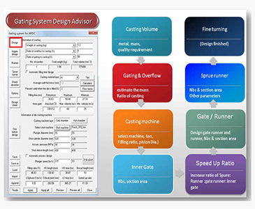 設計嚮導將以直觀的方式,引導設計人員進行規範的澆鑄系統設計。其中包括內澆口,橫澆道,直澆道,分流錐和緩衝器等。根據鑄件材質、重量、品質等因數,提供最優化的鑄造工藝參數,並且以此為目標,完成標準的流道設計。所有結果均以三維 CAD 為基礎,所見即所得,全參數化,方便修改。