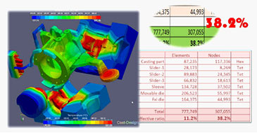 上圖為整體模具的分析結果,鑄件與模具網格相比,利用率非常高。鑄件採用六面體元素,117,336節點,模具採用四面體元素,定模側44,993節點,動模側55,997節點,加上滑塊,鑄件網格在整套模型中的利用率高達38.2%