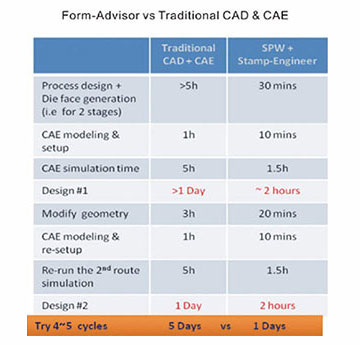 SPW 模組10倍速于傳統 CAD 建模速度,因此模具方案設計師可設計早期,在很短時間內進行提出多個不同設計方案,並進行CAE驗證。通常而言,對於一般複雜零部件,在一個工作日內 Form-Advisor 可以完成4到5個設計。